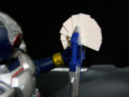 | ブレイラウザーマウント用のホルスターは自作。 ビニールテープをわっか状にし、ダークブルーで塗装。ジャックフォームで余ったスペードマークを貼り付けておきました。 | |